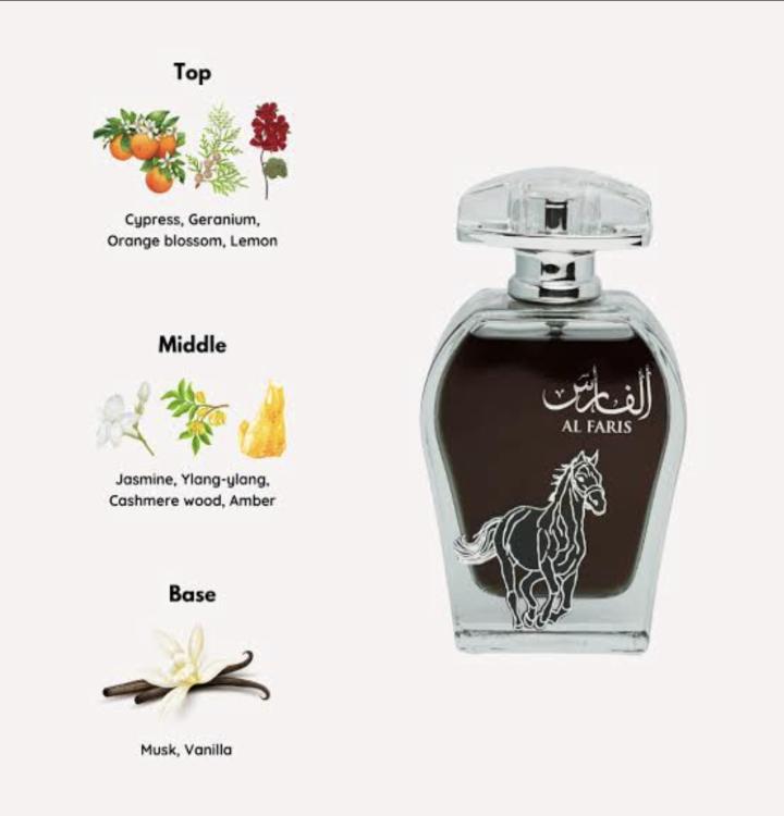 Al Faris perfume features a blend of citrus, white floral, and woody notes. The top notes typically include bergamot and citrus, while the heart notes often feature jasmine and white floral accords. The base notes are woody, including oud, musk, vanilla, and sandalwood.