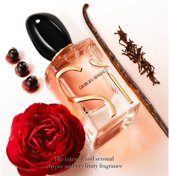 Si Eau de Parfum Intense is a Chypre Floral fragrance. Si Eau de Parfum Intense was launched in 2023. Top note is Black Currant; middle notes are May Rose and Davana; base notes are Bourbon Vanilla, Vanilla, Patchouli and Black Tea.